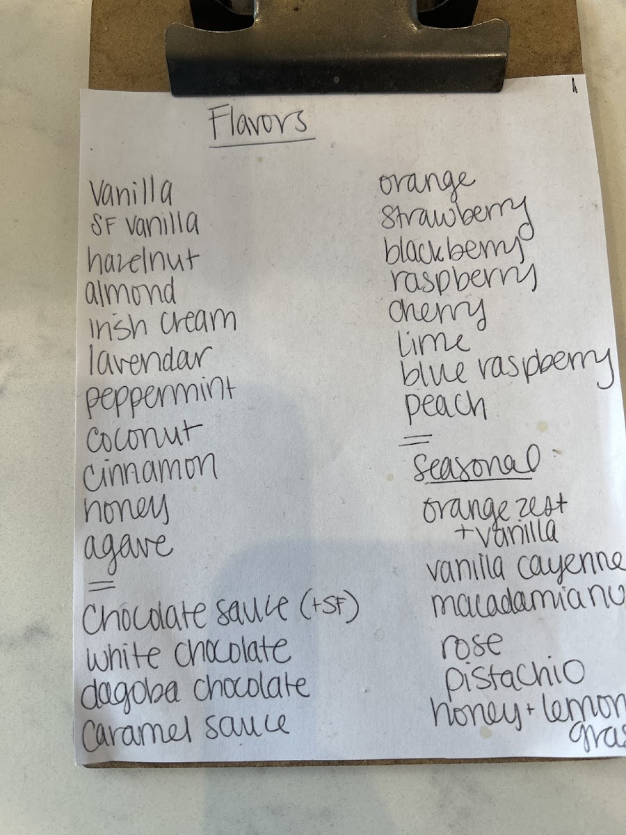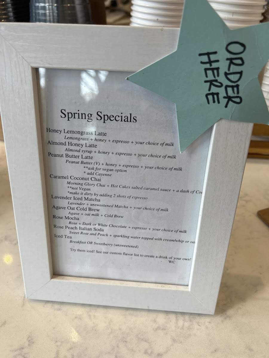 - Spring Specials: Includes Honey Lemongrass Latte, Almond Honey Latte, Peanut Butter Latte, Caramel Coconut Chai, Lavender Iced Matcha, Agave Oat Cold Brew, Rose Mocha, Rose Peach Italian Soda, and Iced Tea.